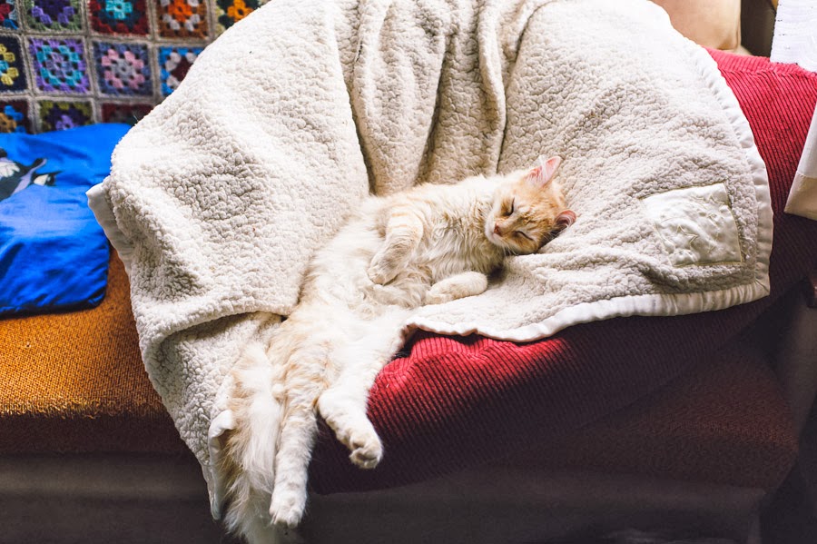 Yesterday was my last day at work. Today was my first day at life. So I made the bed, with my helper.